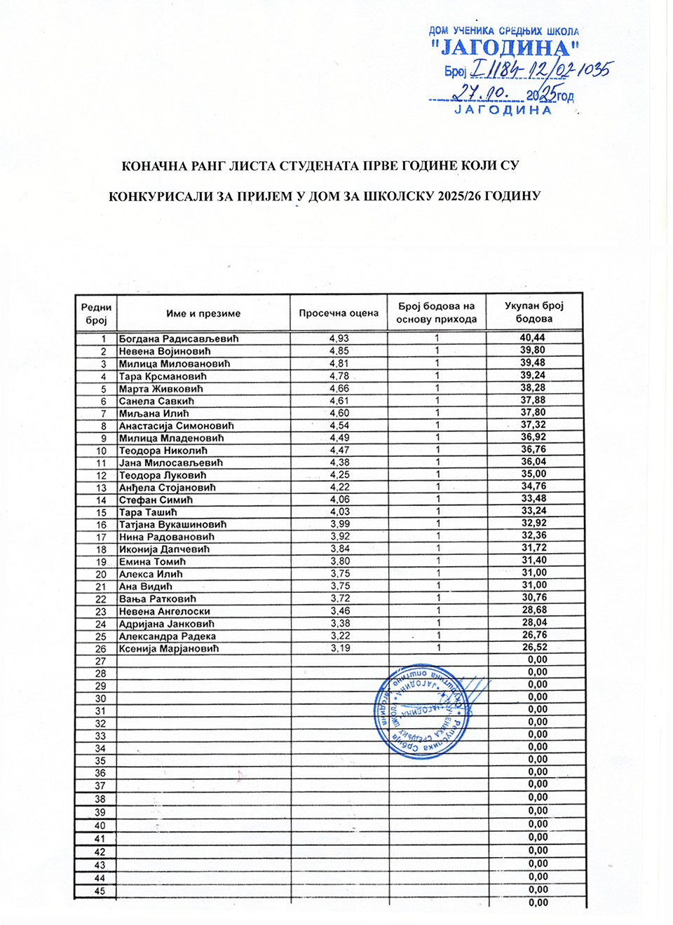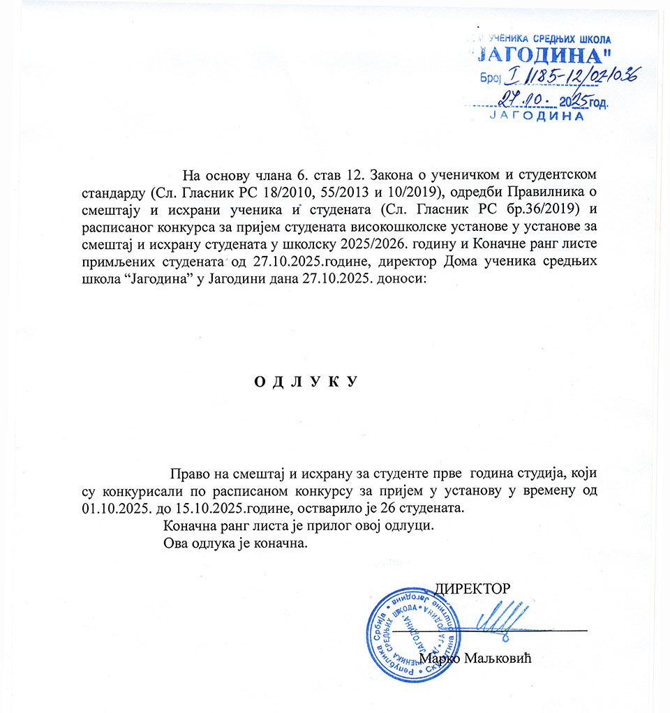 Овде можете погледати коначну ранг листу студената прве године који су конкурисали за пријем у Дом ученика средњих школа „Јагодина“ за школску 2025-2026. годину.